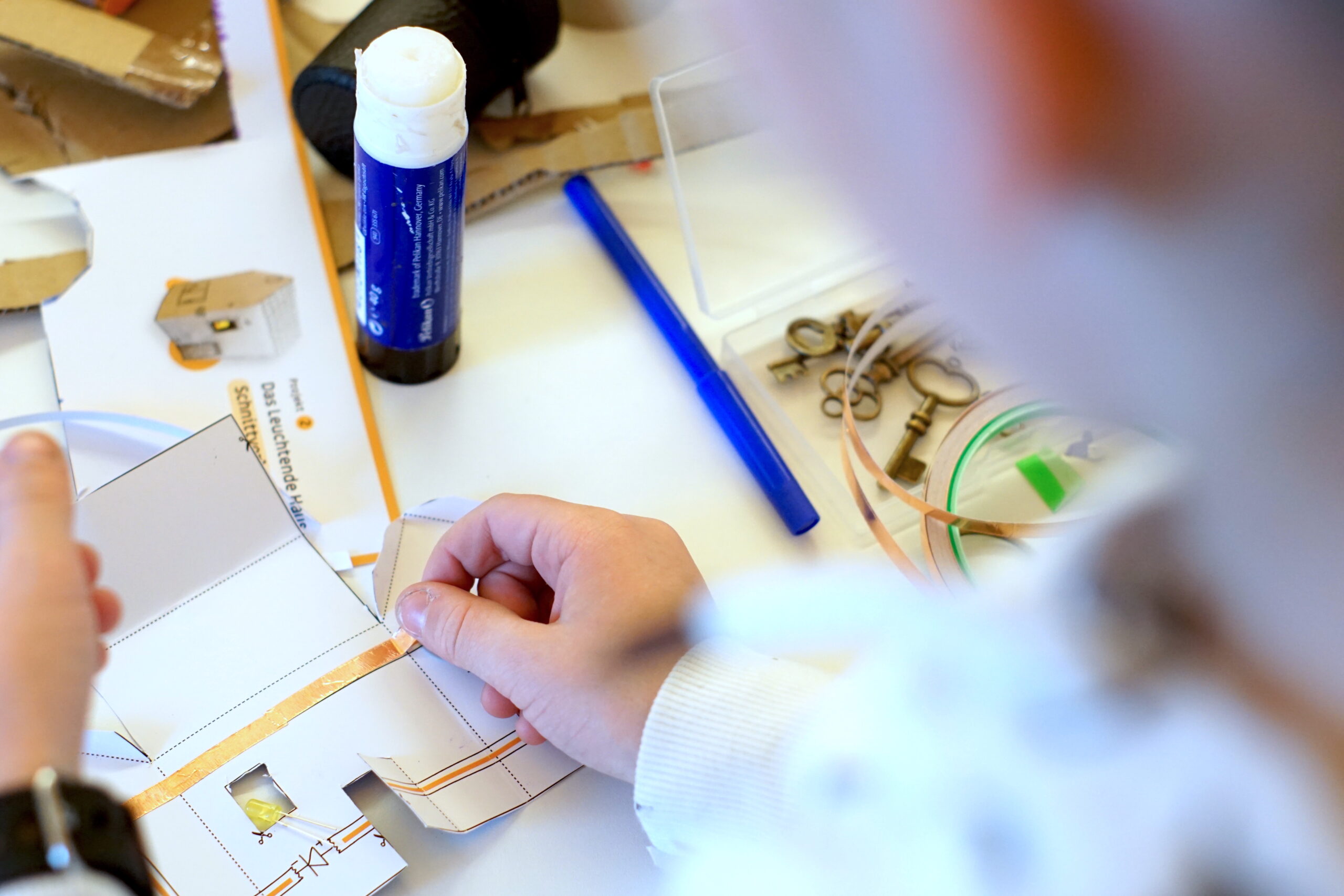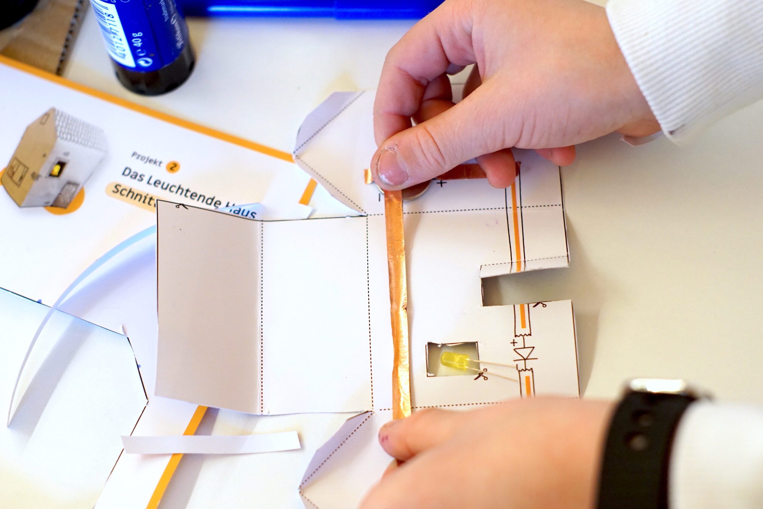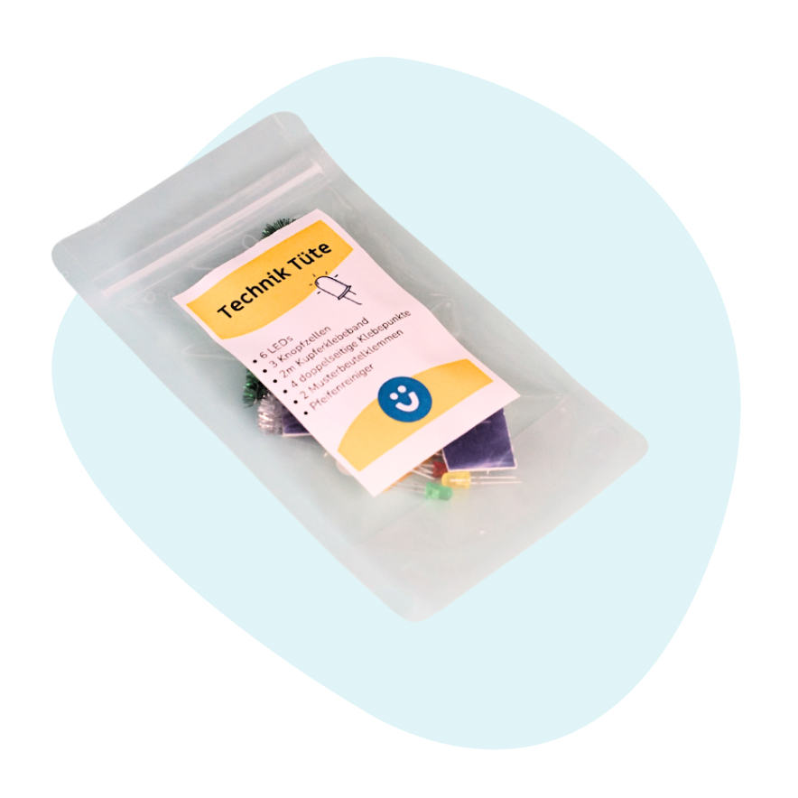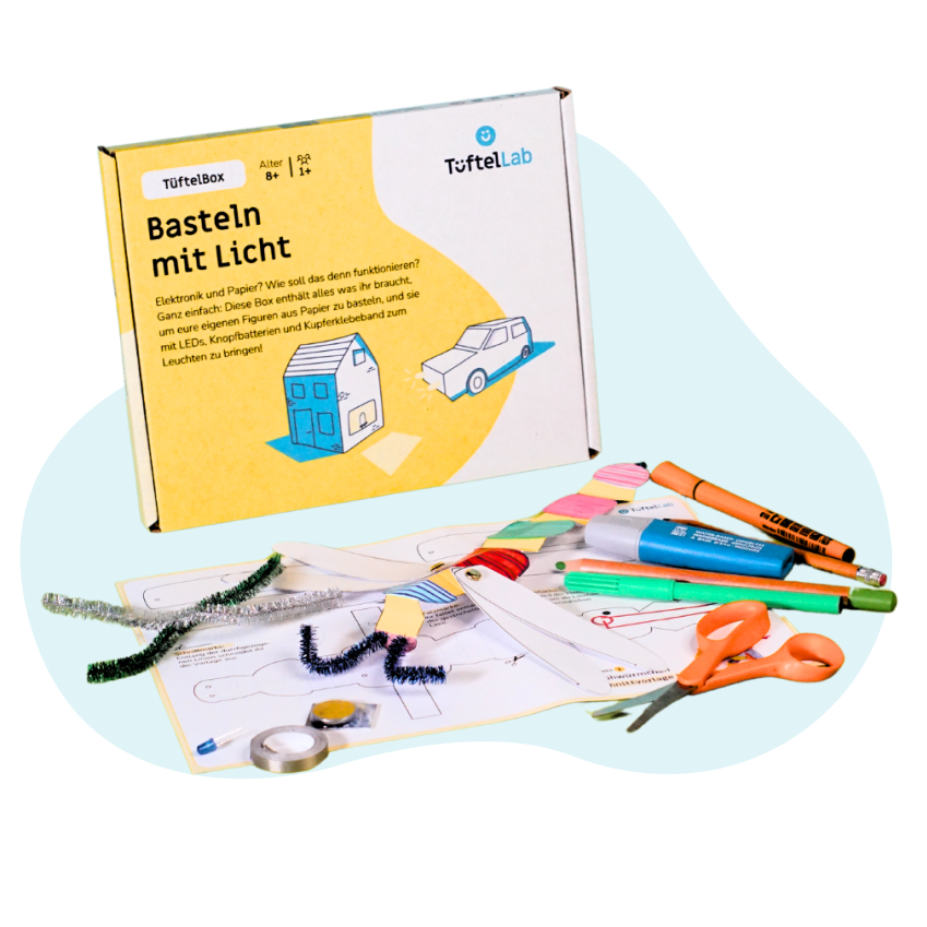 Elektronik und Papier? Mit den Bastelprojekten in der TüftelBox Basteln mit Licht experimentiert ihr mit LEDs, Kupferklebeband und Knopfbatterien.