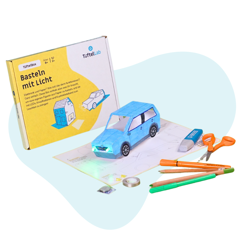ab 8 JahreFür diese TüftelBox braucht ihr ein wenig Bastelübung. Doch schnell werdet ihr sehen, wie einfach es ist, Papierstromkreise zu erstellen – da wird euch ein Licht aufgehen! Kreiert Glühwürmchen, Autos oder Häuser, ganz nach euren Vorstellungen und taucht in die Welt der Stromkreise ein.