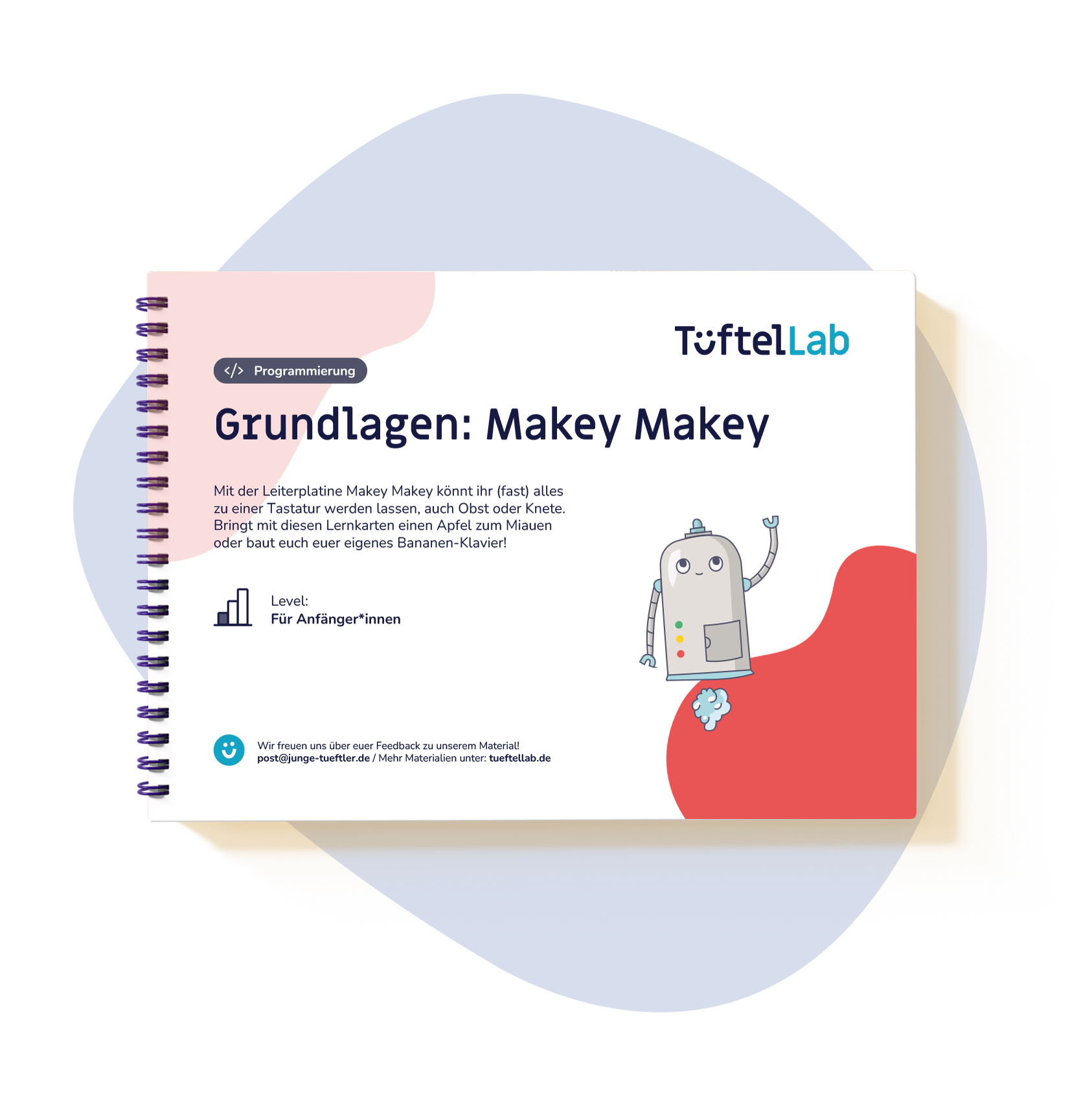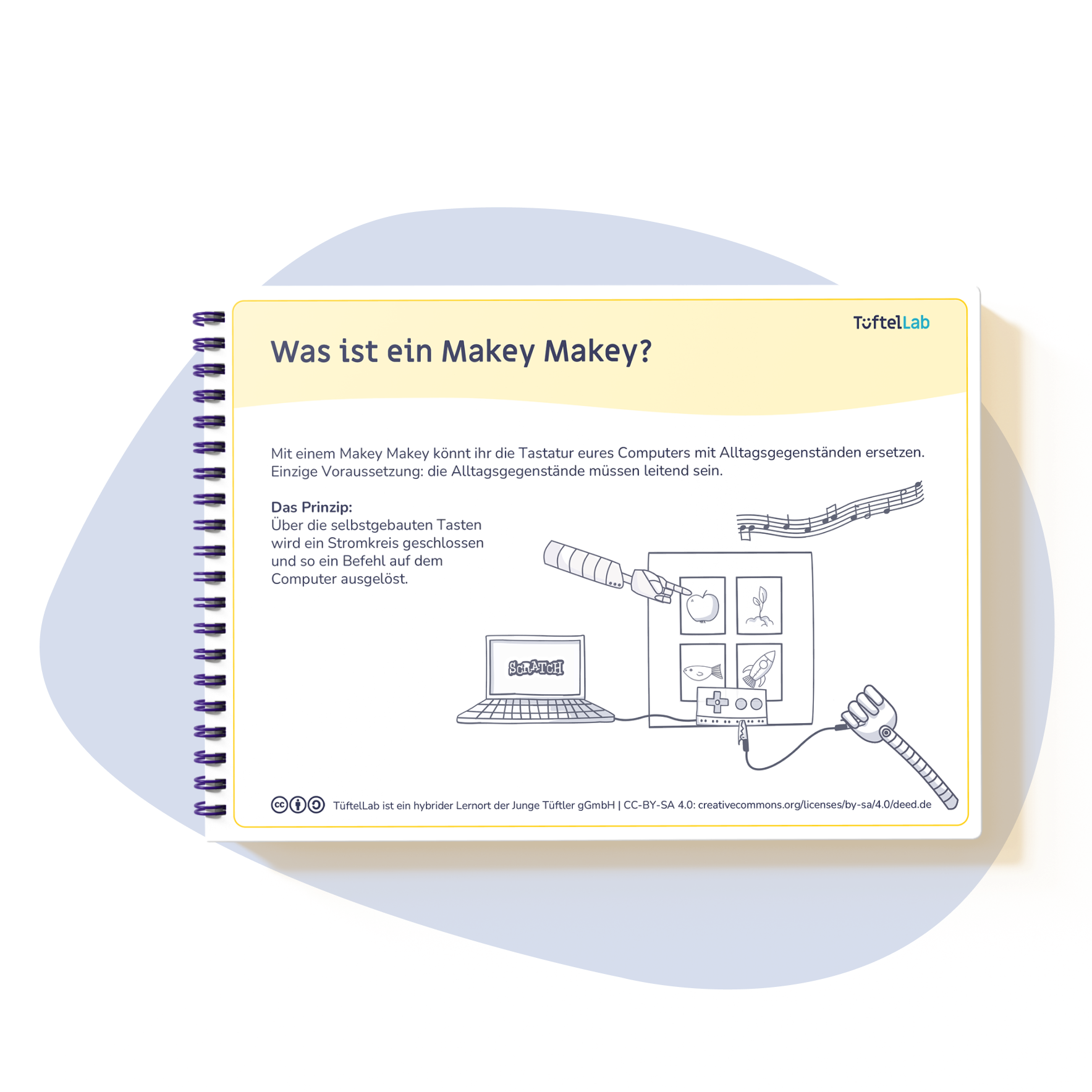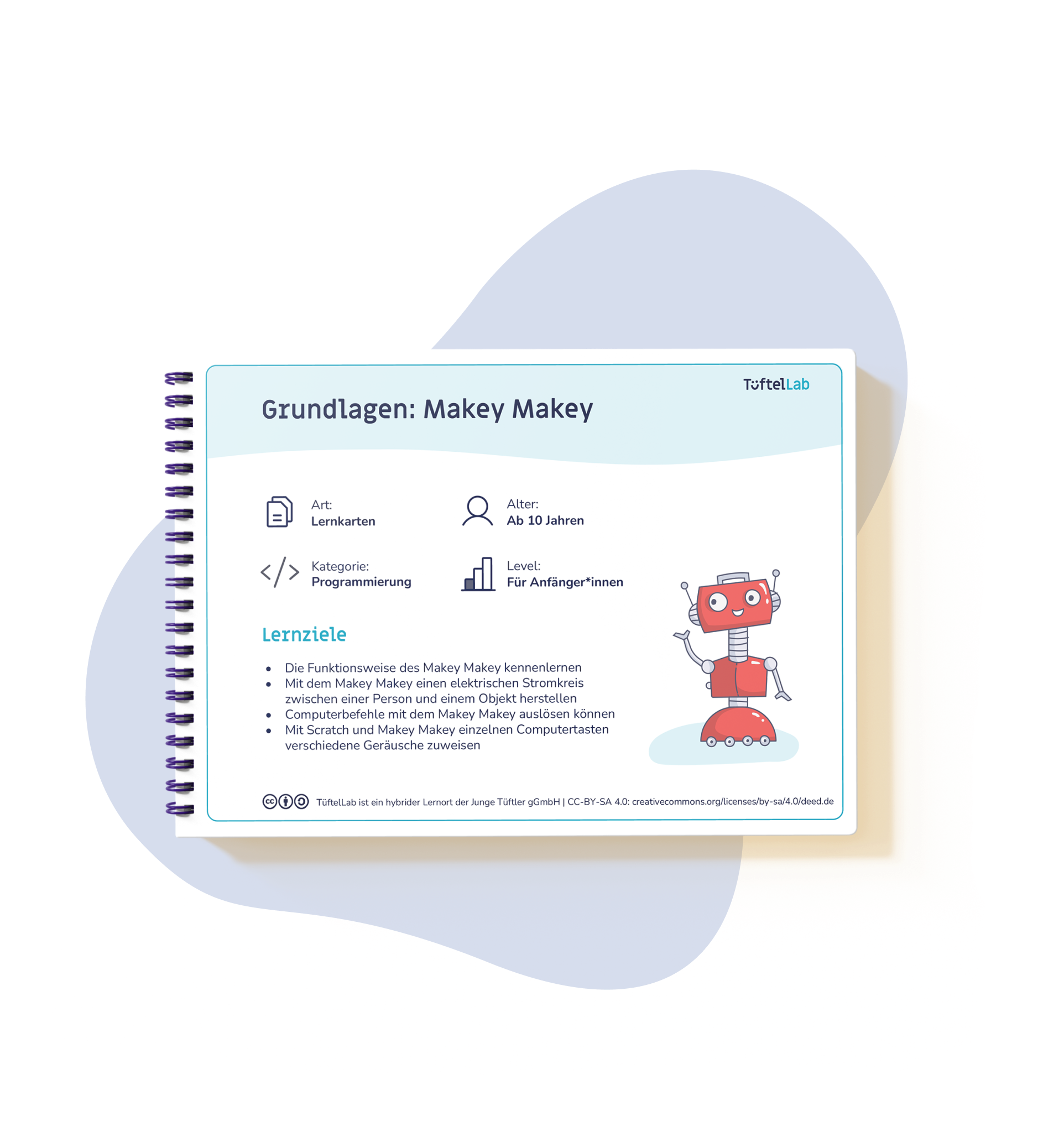 Unsere Lernkarten unterstützen euch beim Einstieg in die Oberfläche und zeigen die wichtigsten Funktionen des Makey Makey. Erkundet das Programmieren auf spielerische Art und Weise!