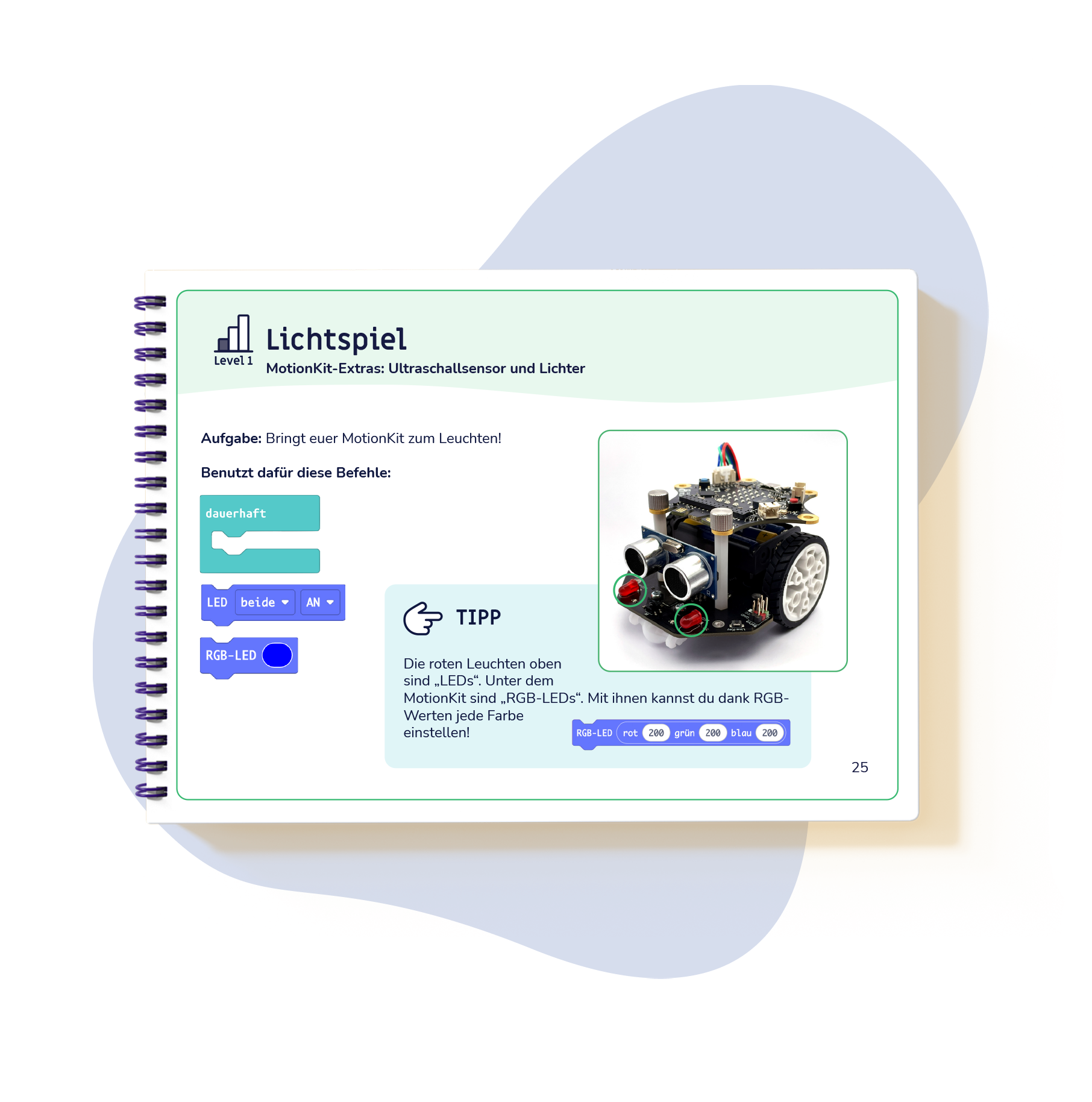 Das MotionKit ist ein Zusatzset für den Calliope mint und bringt euren Mikrocontroller ganz leicht in Bewegung, zum Leuchten und zum Ausweichen vor Hindernissen. Eure Schritt-für-Schritt Anleitung zum Robotikprofi!