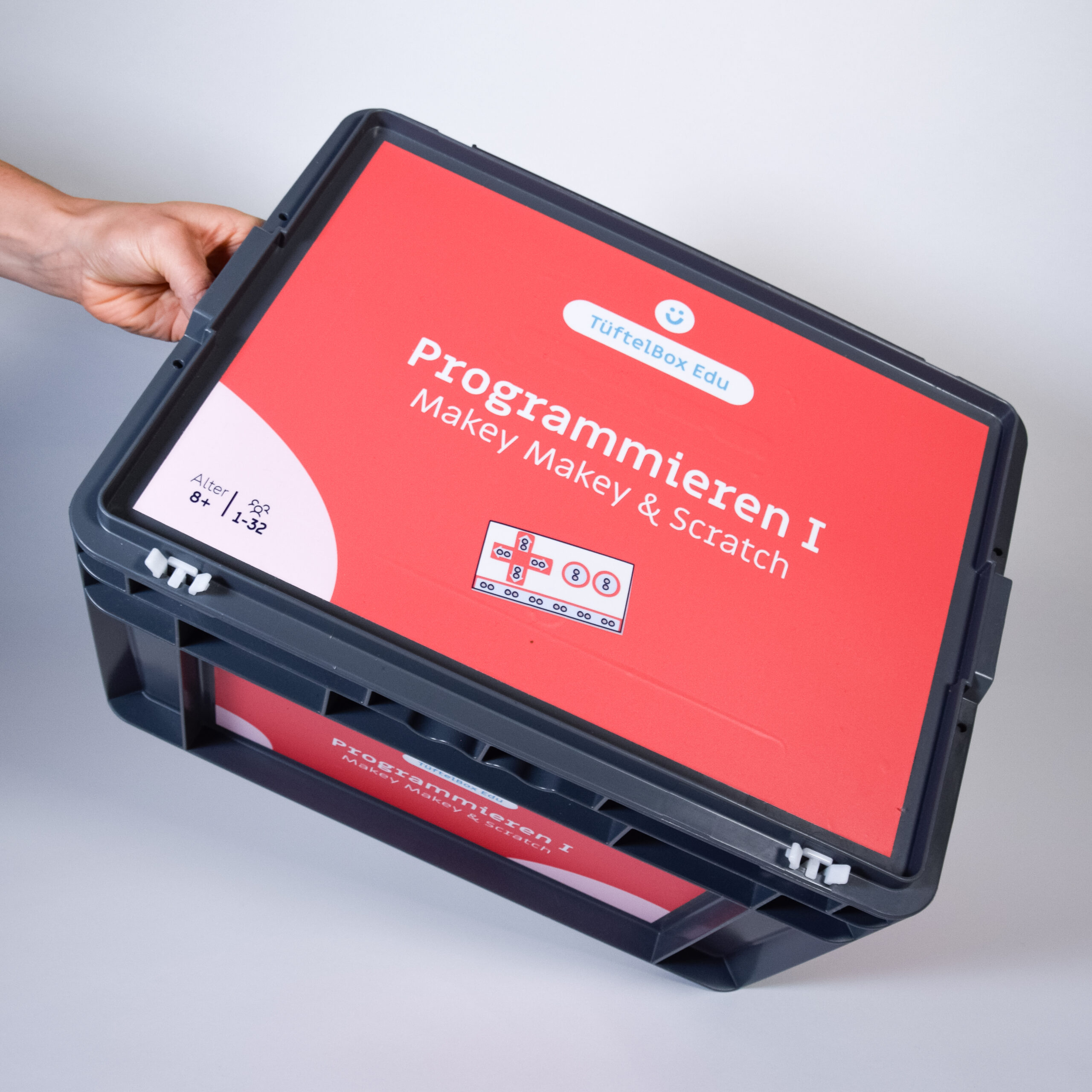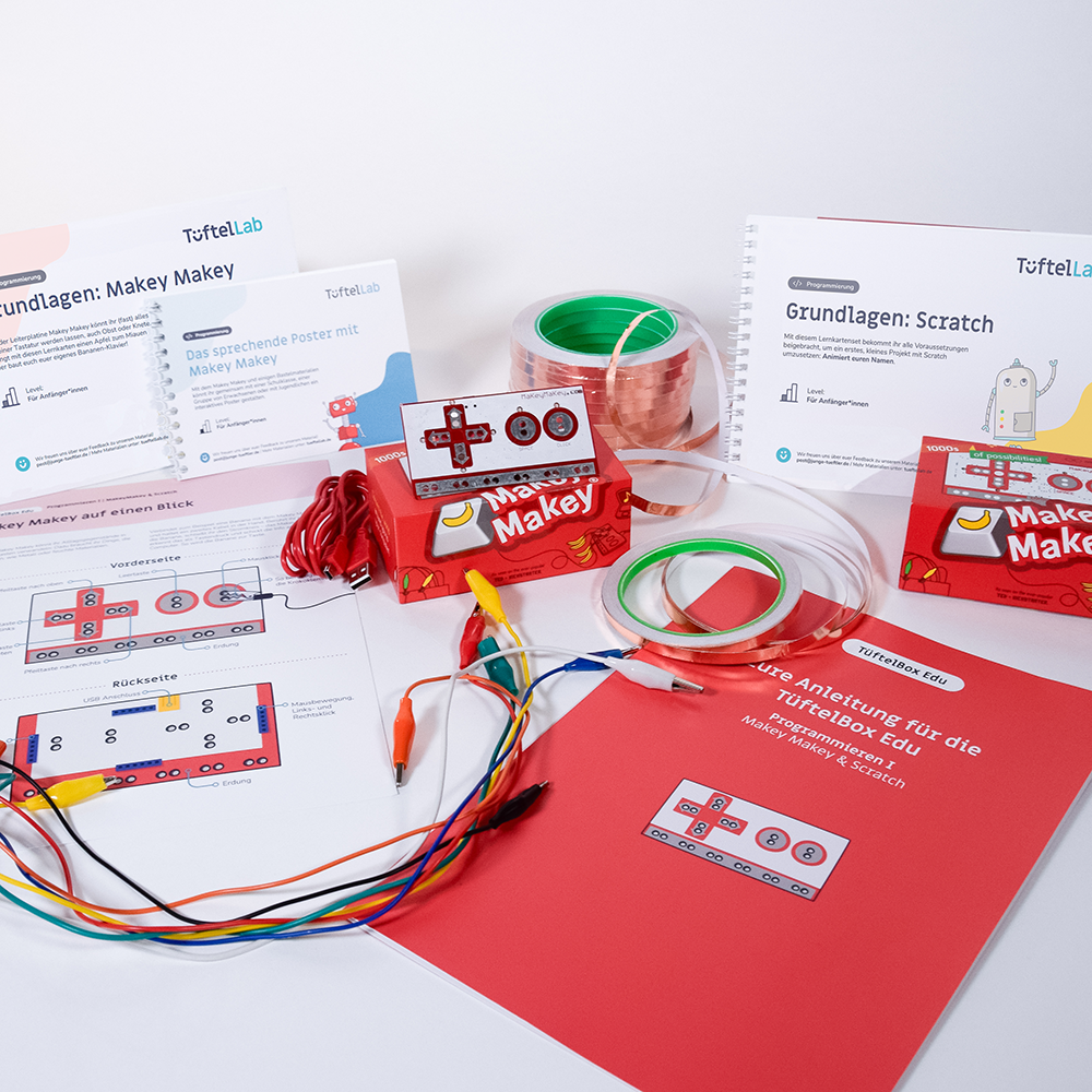 Mit der TüftelBox Edu gelingt der Zugang zu Programmierung und Technik ganz einfach: Vom ersten Stromkreis bis zum interaktiven Periodensystem – eure Lernenden gestalten eigene Projekte mit dem Mikrocontroller Makey Makey und der blockbasierten Programmiersprache Scratch.